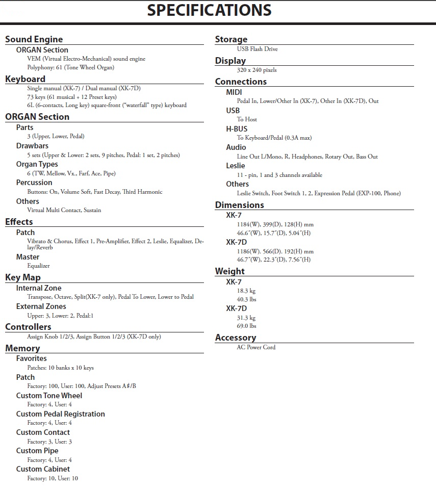 - Dual-manual (XK-7D) and single-manual (XK-7) offered as separate dedicated units – no longer necessary to add a second keyboard to a single-manual instrument to create a dual-manual organ.